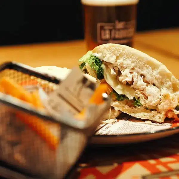El Apechugao, nos marcamos un clásico andaluz que nunca falla… pero a nuestra manera. Pan campero calentito, pollo jugoso recién hecho, lonchas de queso fundiéndose poquito a poco, tomate fresco y lechuga crujiente. Un bocado completo, sabroso y 100% malagueño que, si lo acompañas con una de nuestras cervezas artesanas, se convierte en planazo de celebración.