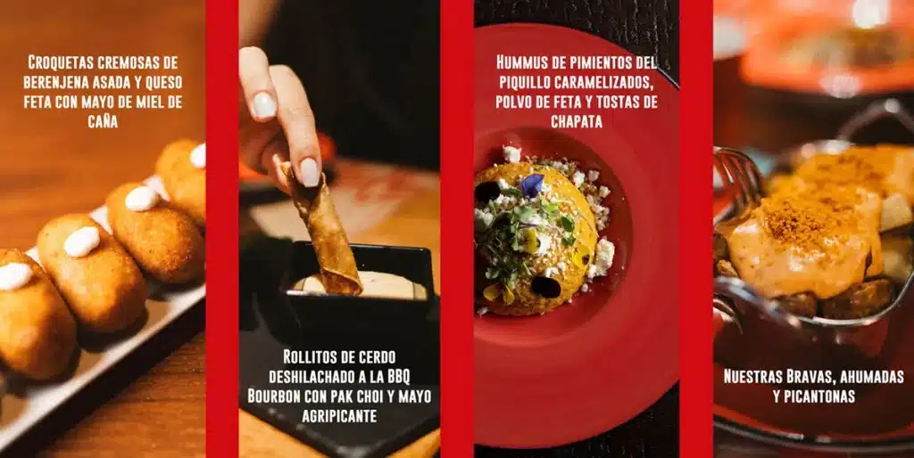 Croquetas cremosas de berenjena asada y queso feta con mayo de miel de caña, rollitos de cerdo deshilachado a la BBQ con pak choi y mayo agripicante, hummus de piquillos caramelizados con polvo de feta y tostas de chapata, y nuestras bravas ahumadas y picantonas.