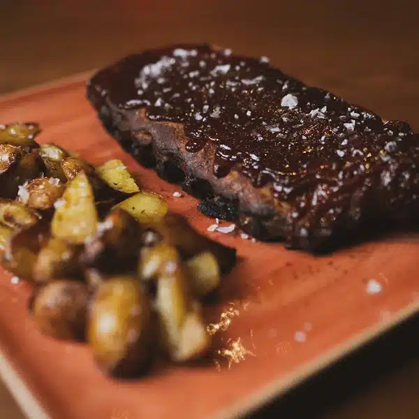 El Costillar de Cerdo, tierno por dentro y con ese glaseado jugoso que se te queda en los dedos (y no te importa), acompañado de patatas baby que se comen solas.